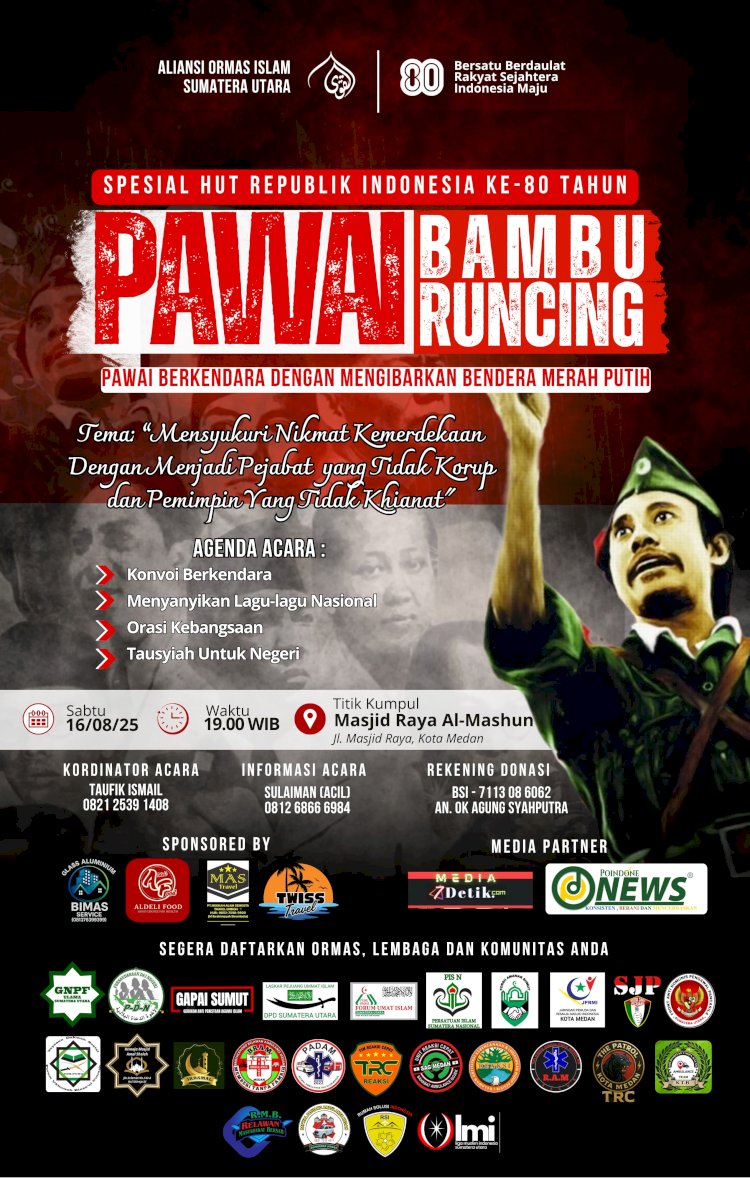 Medan, poindonews.com | 7 Agustus 2025 Dalam semangat menyambut Hari Ulang Tahun Kemerdekaan Republik Indonesia yang ke-80, Rumah Solusi Indonesia (RSI) turut ambil bagian dalam Pawai Bambu Runcing yang akan digelar pada tanggal 16 Agustus 2025 (Malam Hari) di depan Masjid Raya Al Mashum Jl. SM Raja Medan. Kegiatan ini diselenggarakan oleh Aliansi Ormas Islam, Ormas Nasionalis dan berbagai komunitas yang ada di Sumatera Utara sebagai bentuk penghormatan kepada para pahlawan serta mempererat semangat persatuan bangsa.